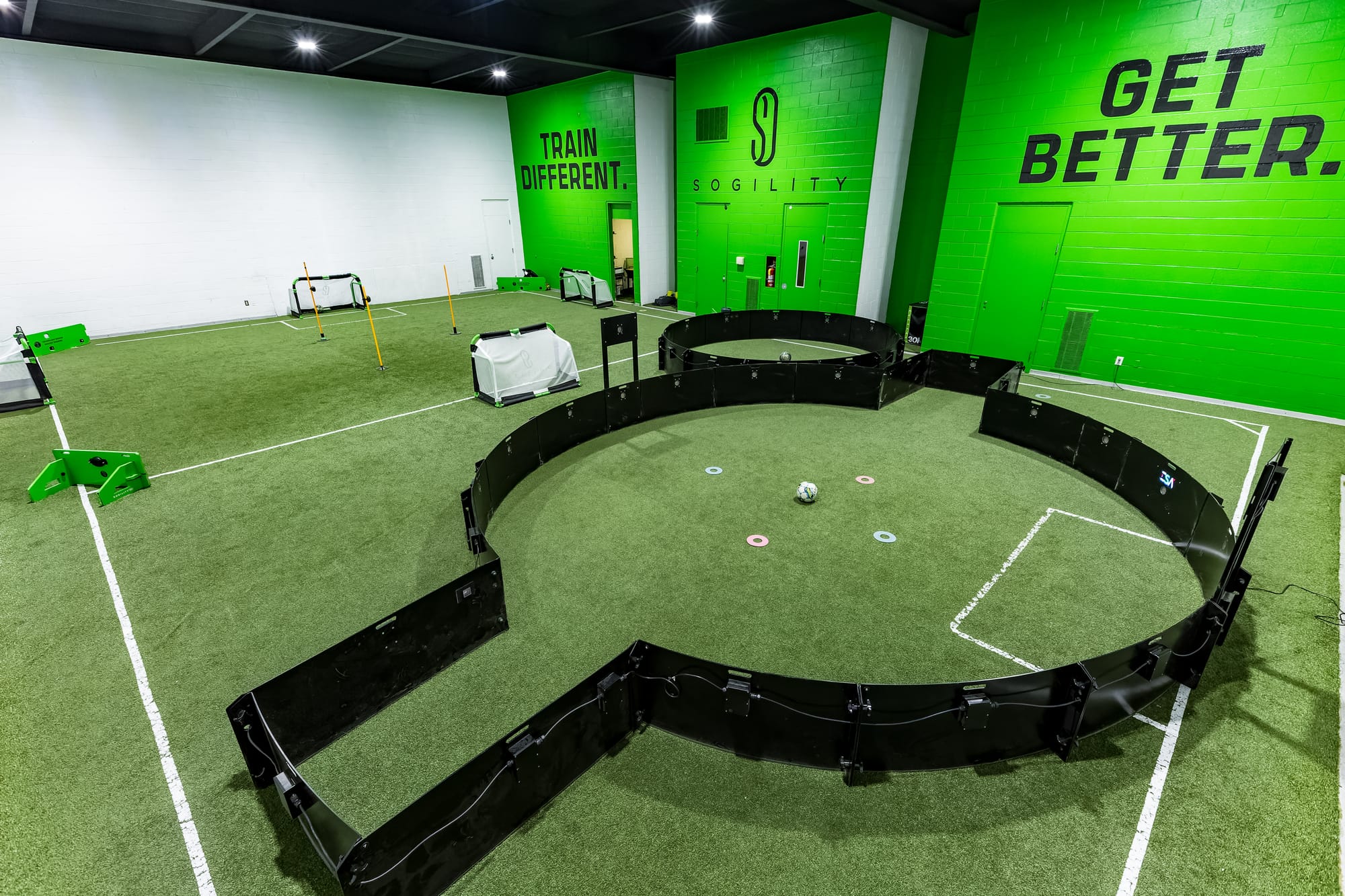 Lo spazio è impostato meno come un classico campo da calcio indoor e più come un laboratorio di allenamento. Pensare aree di tappeto erboso di lato piccolo, stazioni con pannelli di rimbalzo e luci, e spazi progettati per misurare quanti tocca un giocatore prende, quanto rapidamente spostano la palla, e quale piede favoriscono.